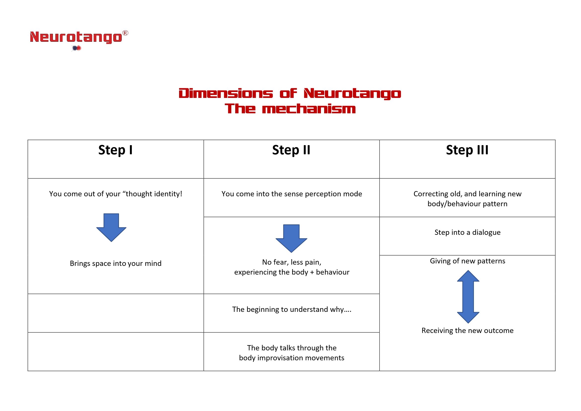 Neurotango® is a combination of discovering and processing the emotion, including the change of behavioural patterns. The body discovers faulty behaviour patterns or blockages immediately. These can also lead to being unable to perform movements or exercises because psychological barriers prevent them from doing so. Sometimes a period of inner and cognitive awareness is needed to master both. Physical exercise and psychological development. Both happen in parallel. Suddenly the participant will be able to do the exercise and the psychological change is clearly visible in a social change (e.g., new partnership, new job, change of flat etc.).